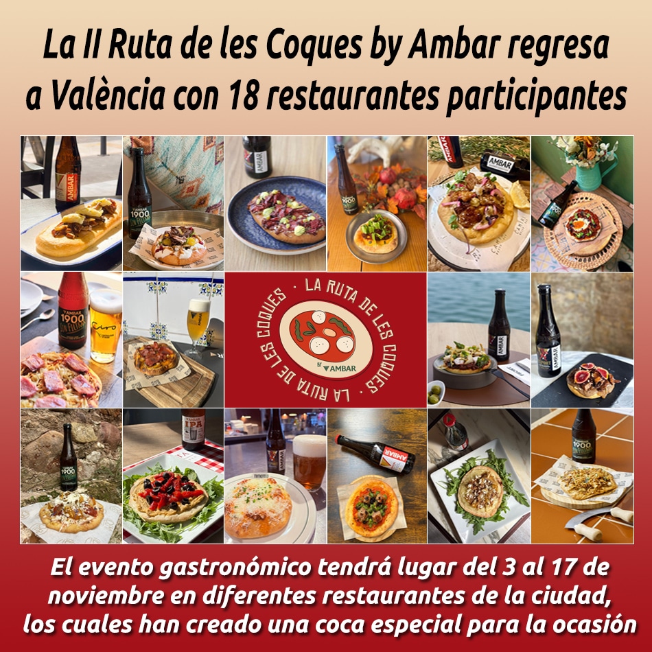 Durante estas dos semanas, por 10 € se puede disfrutar de la coca especial del local participante + un tercio de cerveza Ambar (o maridaje de vino opcional) en barrios como Ruzafa, Cánovas, Ciutat Vella, Cabañal, Puerto, Extramurs, Campanar y otros.